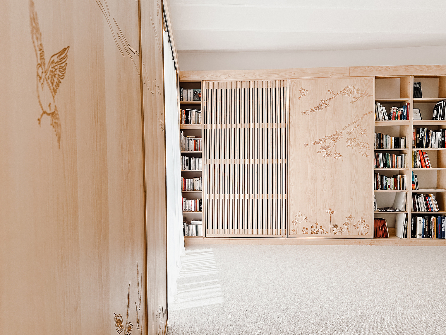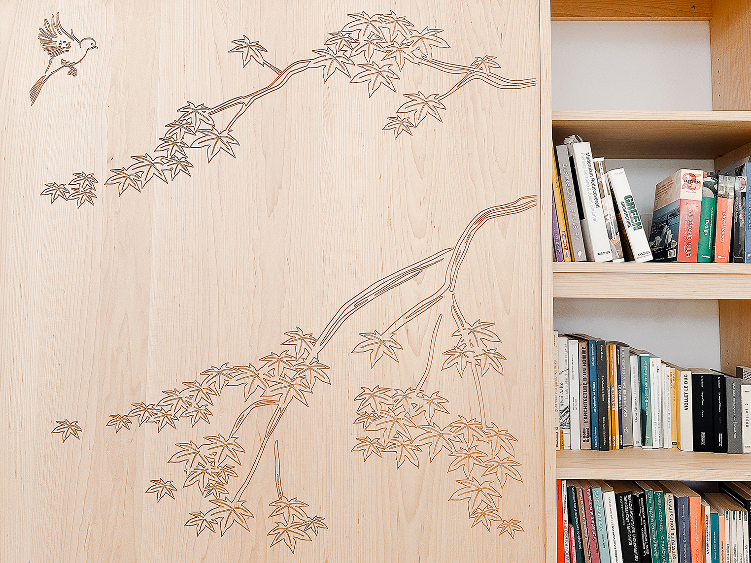 Pour habiller la bibliothèque sur mesure, telle une parure, l’ornementation se fait par le choix de la gravure de motifs réalisés par Nora Feys et propres à l’histoire du projet. On retrouve les éléments phares du jardin : l’érable, les jonquilles et pissenlits, feuillages, oiseaux et chat. Tel un synopsis, la volonté première est la mise en valeur d’un autre regard porté sur le jardin. En référence au « Jardin du lettré » d’Antoine Marcel, l’idée est de porter un regard émerveillé sur la beauté cachée de la nature environnante, une réflexion sur la place de l’homme face à la Nature et sur l’importance de l’équilibre à préserver. La relation entre intérieur et extérieur était donc source première d’inspiration et le point de départ du projet commun. Plus qu’une représentation de la Nature à travers les dessins gravés, c’est l’envie de comprendre et valoriser cette harmonie et les émotions qui se dégagent de notre regard porté sur le jardin quotidien.